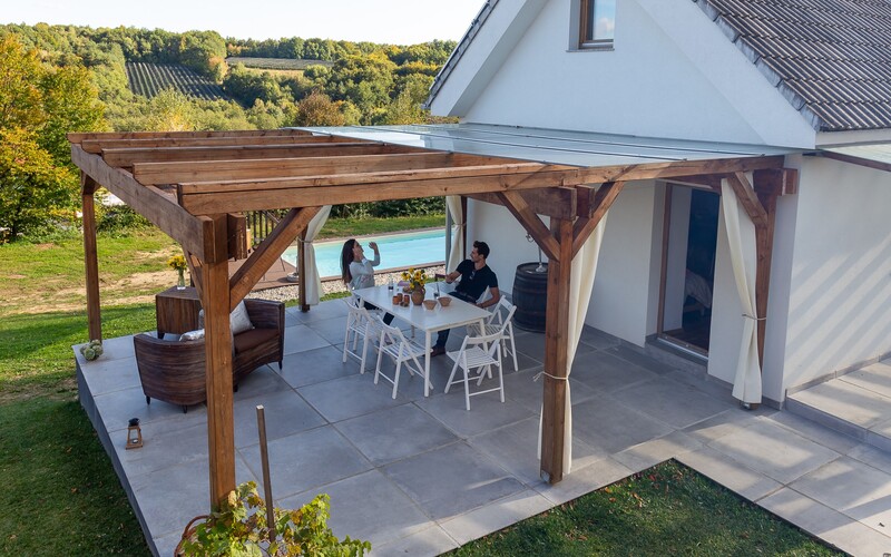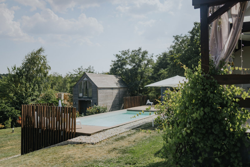 V Velbani hiški se preteklost sreča z moderno sedanjostjo. Hiška leži na sredini kompleksa, pred njo pa je plavalni bazen.