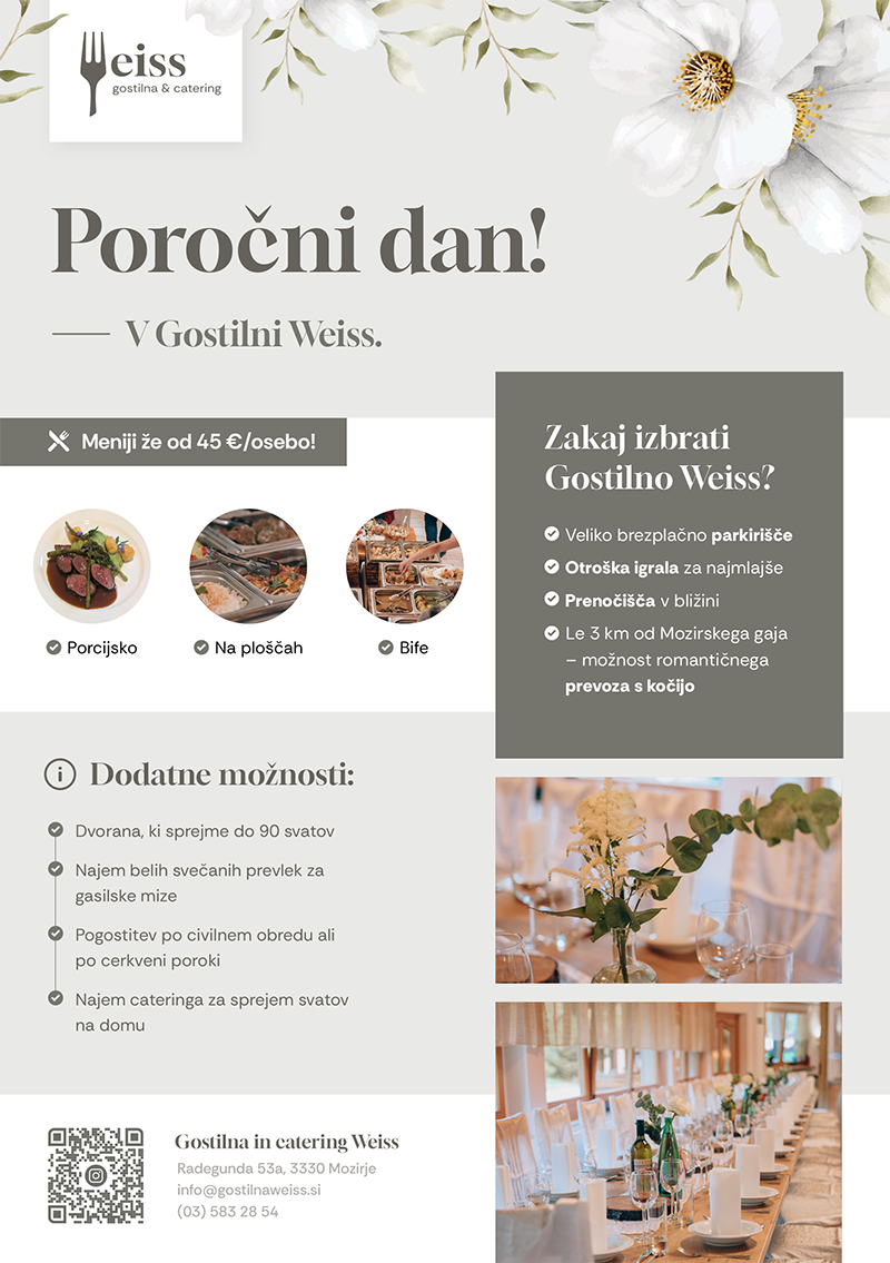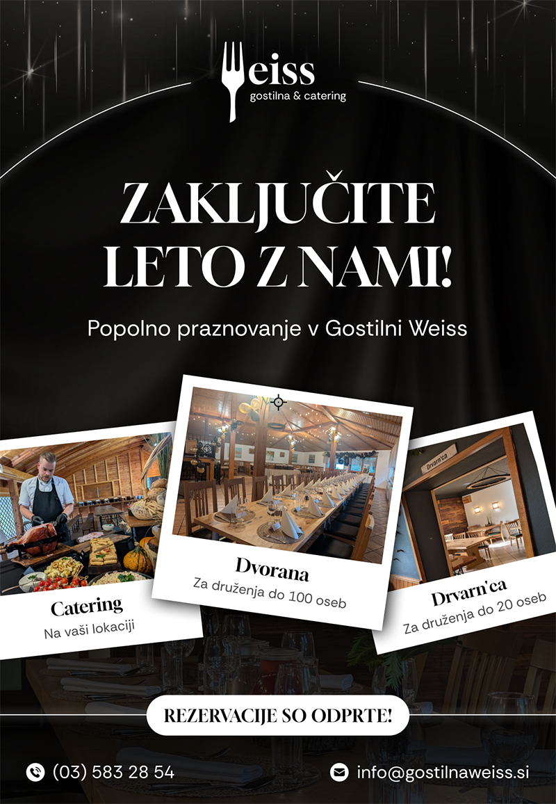 Gostilna in catering Weiss se nahaja le 2 km iz Mozirja, na poti proti idiličnemu smučarsko-turističnemu centru Golte. S svojo domačo kuhinjo in prijaznim osebjem ustvarjamo pristno kulinarično izkušnjo, ki vas bo navdušila. Naša gostilna je idealna izbira za poroke, zaključene družbe, praznovanje rojstnodnevnih zabav, poslovnih srečanj, obletnic in drugih posebnih priložnosti, kjer poskrbimo za popolno postrežbo.