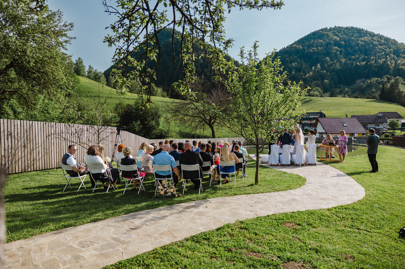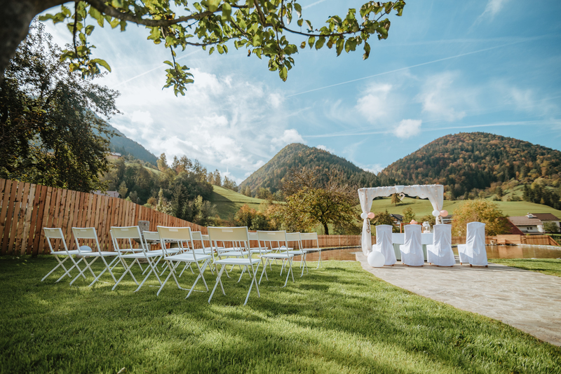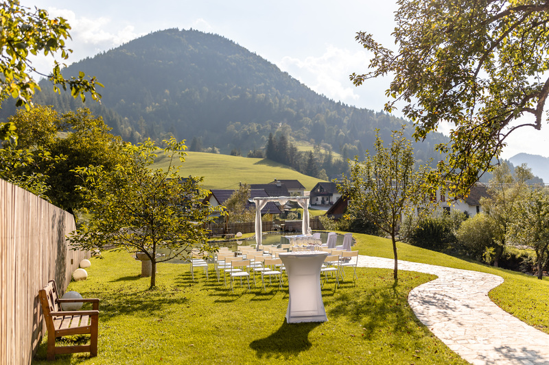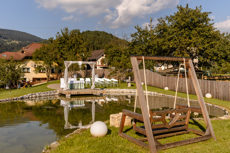 Vaša civilna poroka lahko poteka na našem čudovitem vrtu, kjer poskrbimo za pravljično vzdušje in nepozabno okolje. Ker smo v neposredni bližini cerkve, lahko celoten vaš poročni dan poteka na eni lokaciji – brez skrbi, brez stresa, samo popolni trenutki.