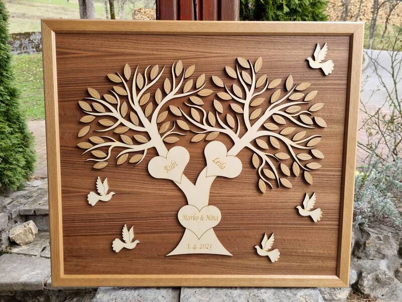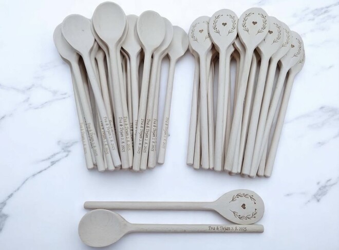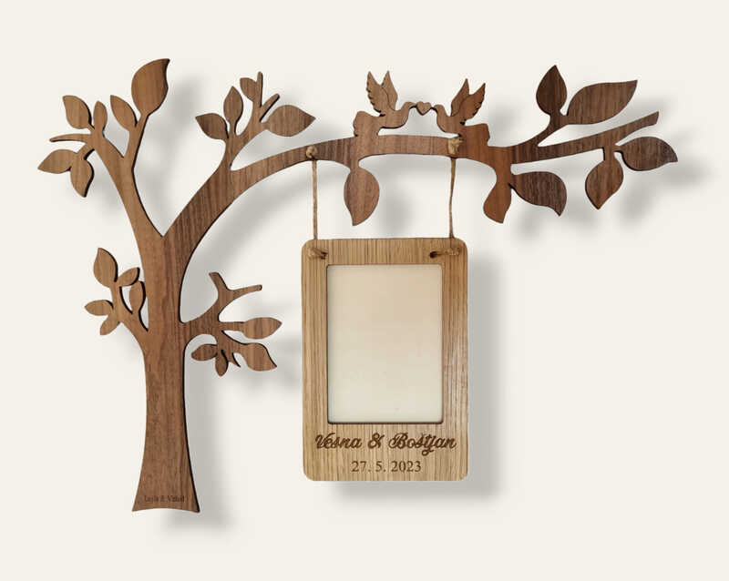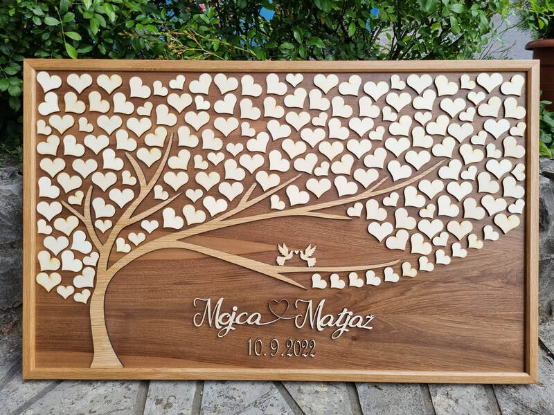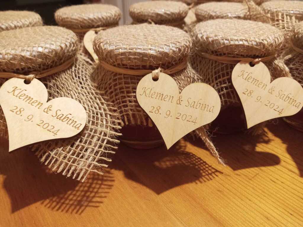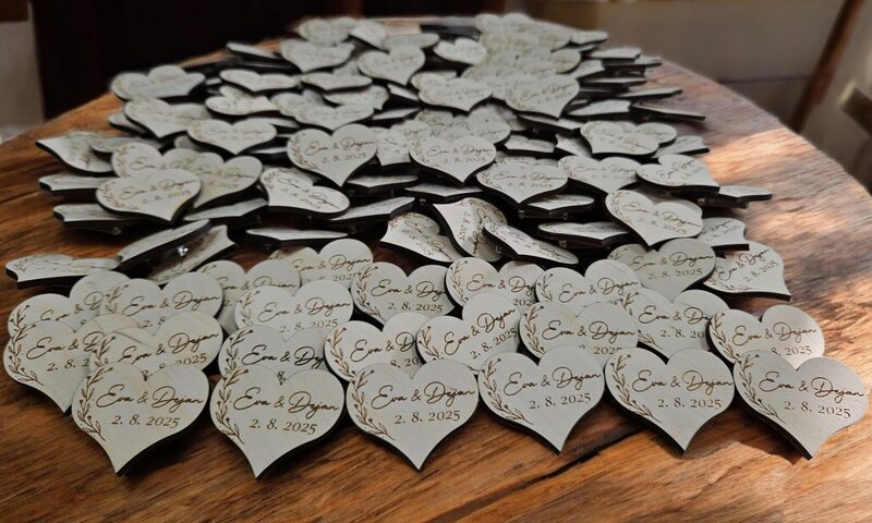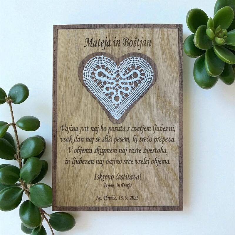 Leseni izdelki dajo na poroki prav poseben čar. Za vajino poroko vam pripravimo table dobrodošlice, toperje, lesene škatljice za želje, lesene srčke kot darilca za svate, deske z vajini imeni, naprsnike, nakit in še mnogo drugih stvari. Idej nam nikoli ne zmanjka. Na vajino željo vam lahko vgraviramo želeno vsebino.