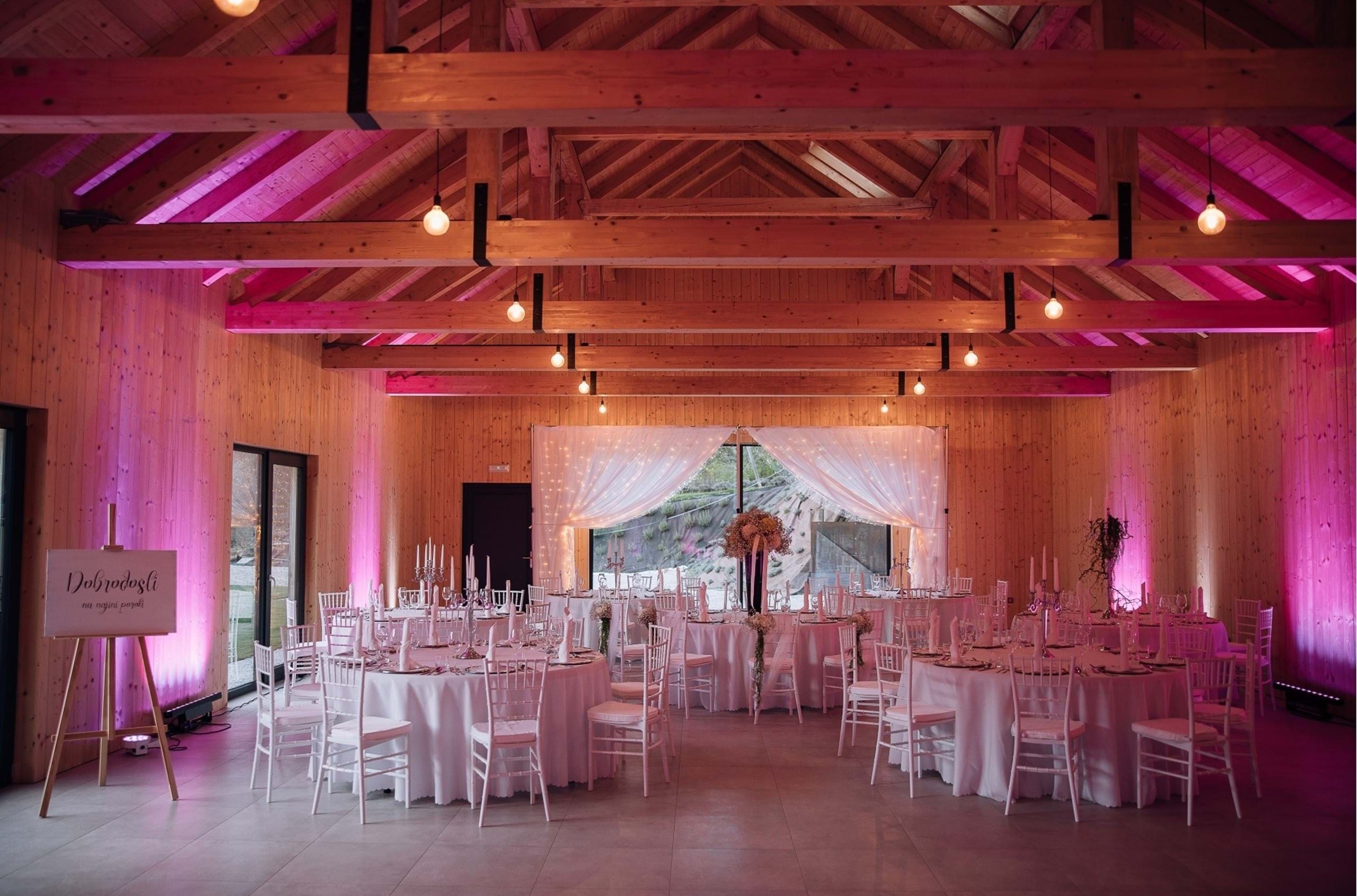 Za popolno udobje poskrbimo s prostornim apartmajem za mladoporočenca, bazenom za sprostitev, ozvočenjem in gostinsko infrastrukturo. Na voljo od razdelilne kuhinje do miz in stolov za vse goste. Prostor sprejme do 140 povabljencev, kar omogoča intimno, a hkrati dovolj veliko slavje.