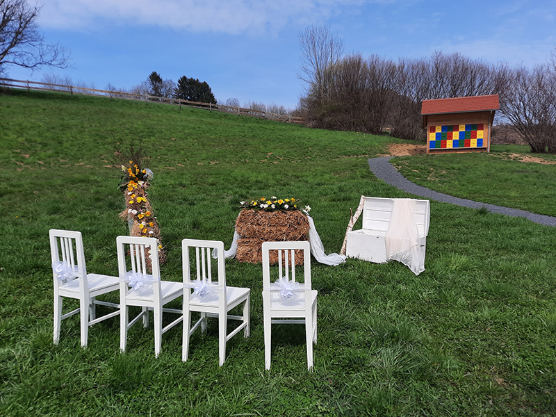 Izbirate lahko med poročnim obredom na prostem ali pod tradicionalnim kozolcem, slavje pa lahko poteka v urejeni Strojni lopi. Sprejmemo do 150 gostov.