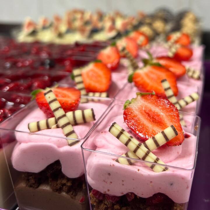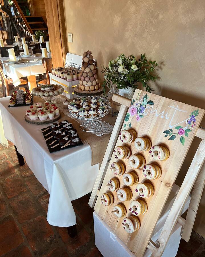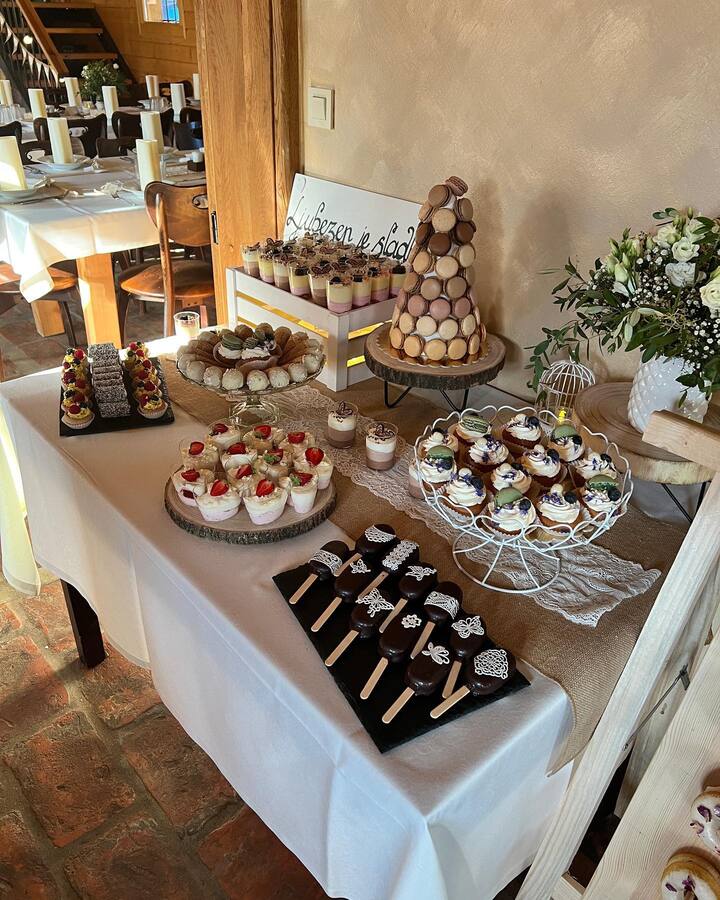 Poročni kotiček dopolnjuje pester izbor različnih sladic – od drobnega peciva in mini tortic do drugih sladkih prigrizkov, ki navdušijo z videzom in okusom. Vsaka sladica je skrbno izbrana, da se lepo vključi v celostno podobo poroke. Raznolike sladke dobrote omogočajo pestro izbiro in ustvarijo prijetno sladko razvajanje za vse goste.