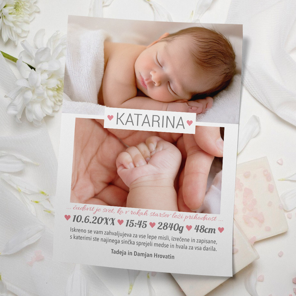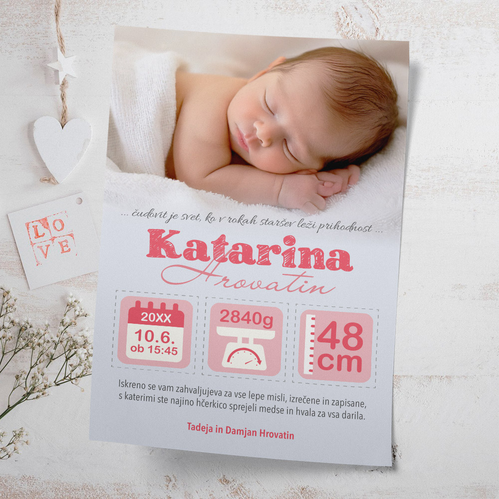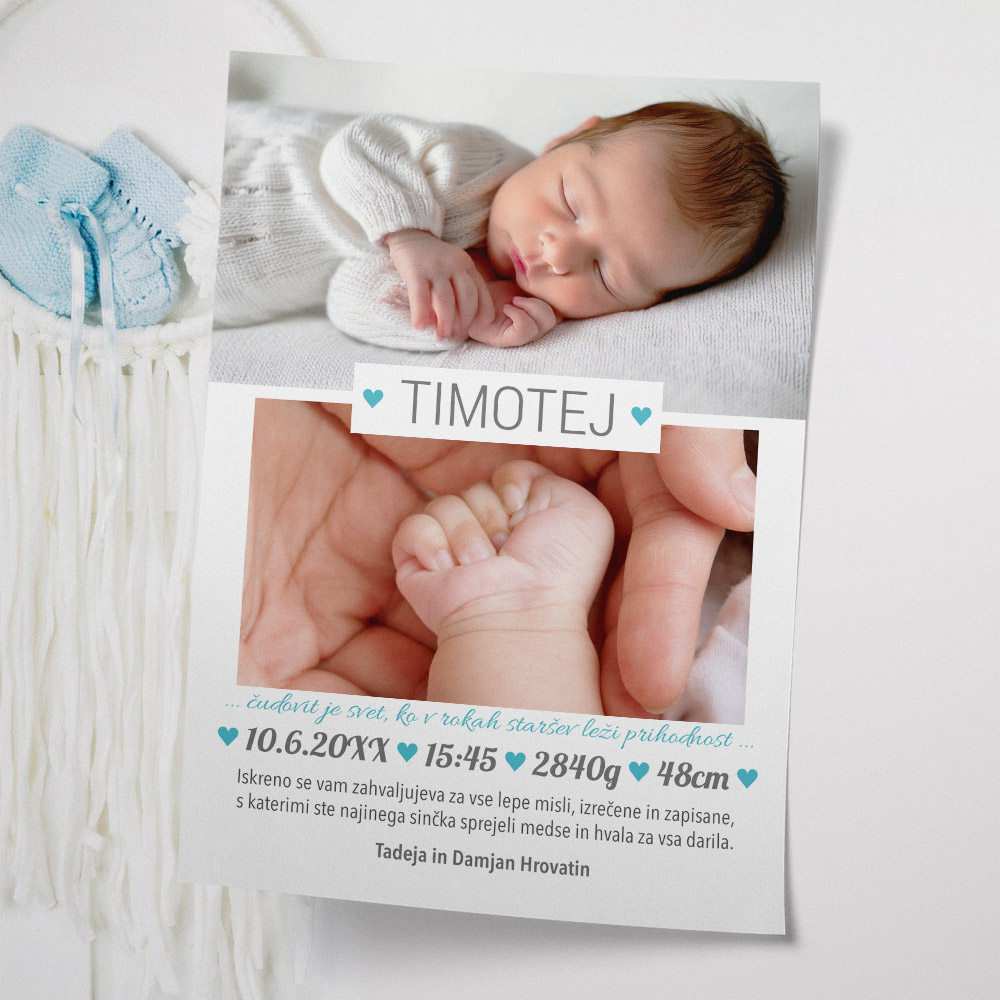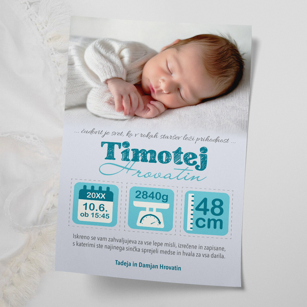 Praznujte prihod novega člana družine na poseben način. Naše voščilnice ob rojstvu otroka so nežne, osebne in polne topline. Vsaka voščilnica je skrbno oblikovana in lahko prilagojena z imenom otroka ali posebnim sporočilom. Tiskamo na kakovostne materiale, da bo voščilnica čudovit spomin za dolga leta.