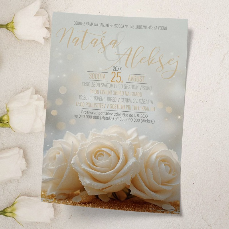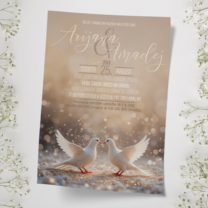 Naša poročna vabila združujejo eleganco, kakovosten tisk in dovršene materiale, ki bodo očarali vajine goste. Vsak kos je skrbno oblikovan, da bo vabilo čudovita napoved vajinega posebnega dne.